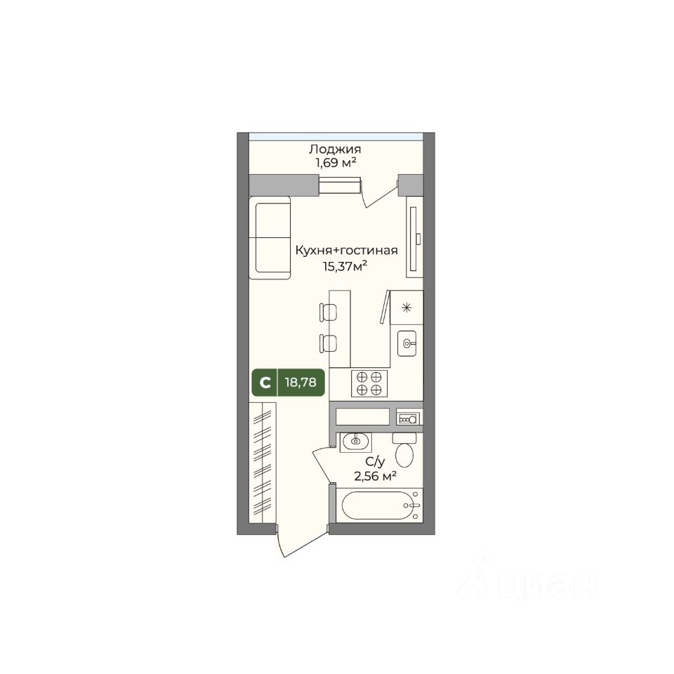 Продаётся студия в строящемся доме (Дом 6), срок сдачи: I-кв. 2026, общей площадью 18.78 кв.м., на 1 этаже.