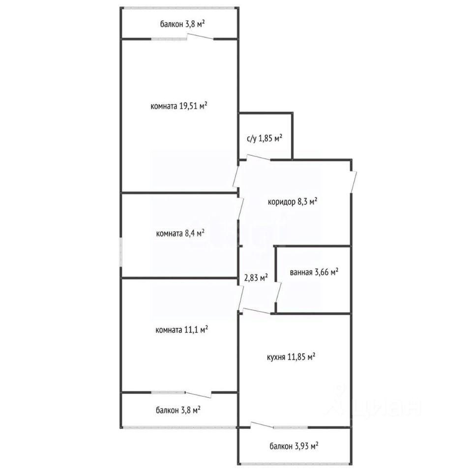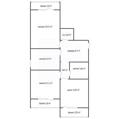 Планировка включает три изолированных помещения: две полноценные спальни, одна из которых с собственным балконом, и большую комнату, которую можно обустроить как гостиную или родительскую спальню.