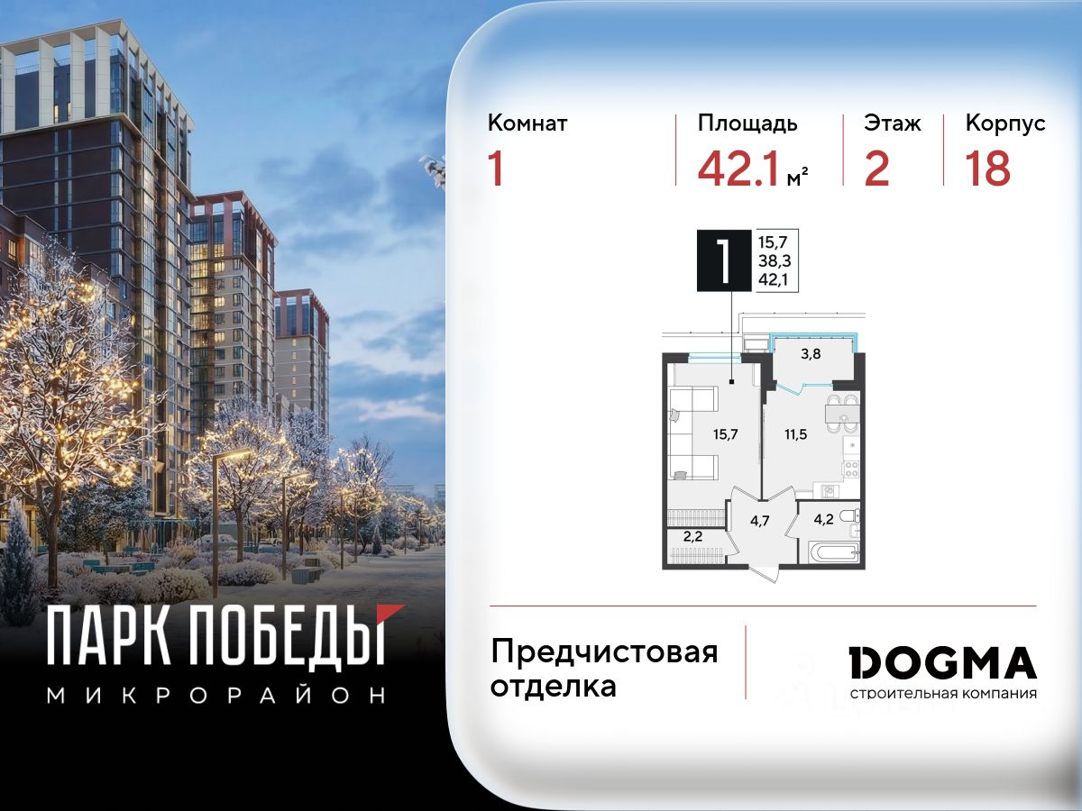 Срок сдачи: 1 кв. 2026, общей площадью 42.1 кв.м., на 2 этаже.