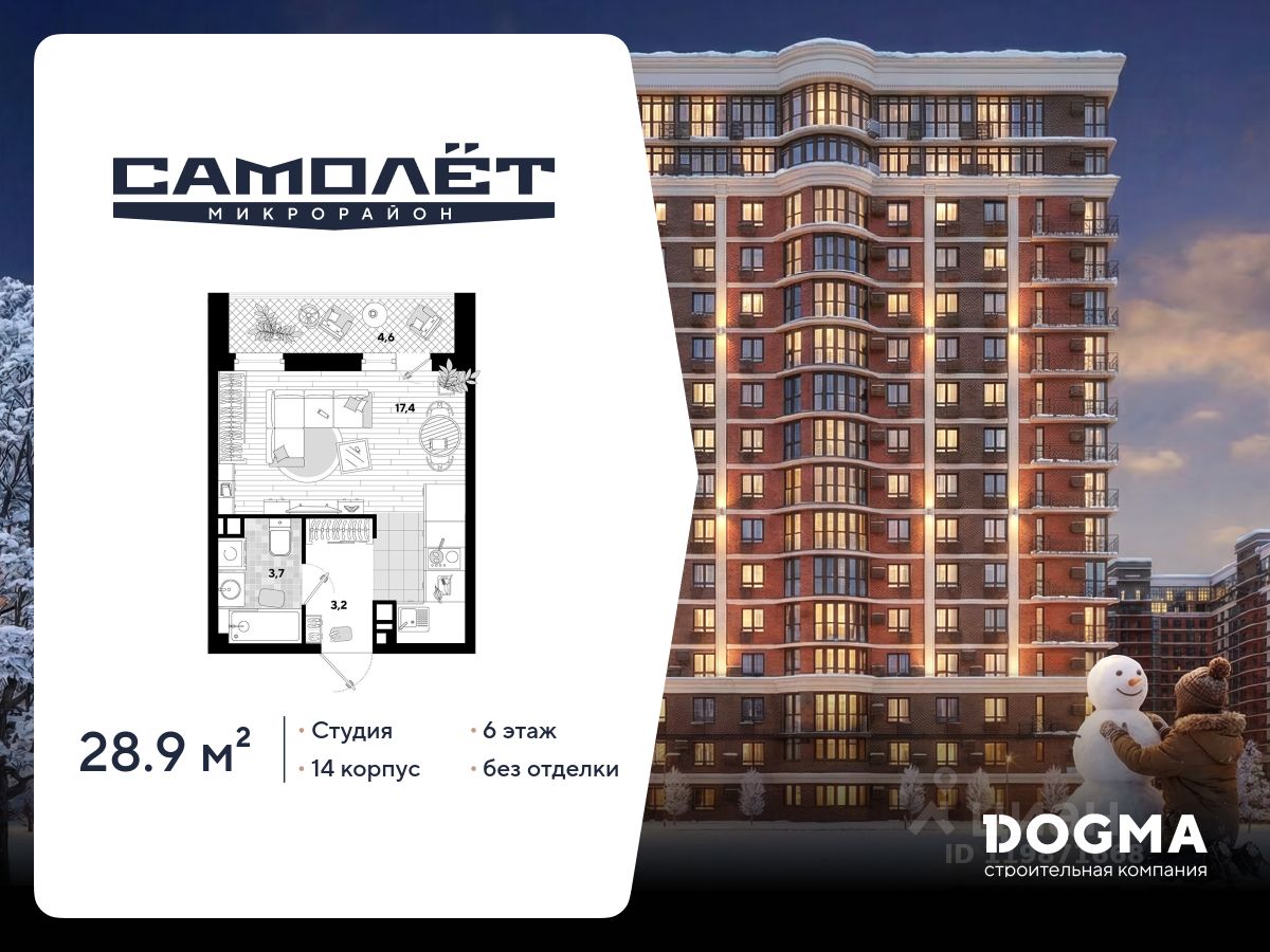 В продаже квартира-студия от застройщика! Мкр. "Самолет" 3 очередь, г. Краснодар, Литер 14 Срок сдачи: 4 кв. 2023, общей площадью 28.9 кв.м., на 6 этаже.