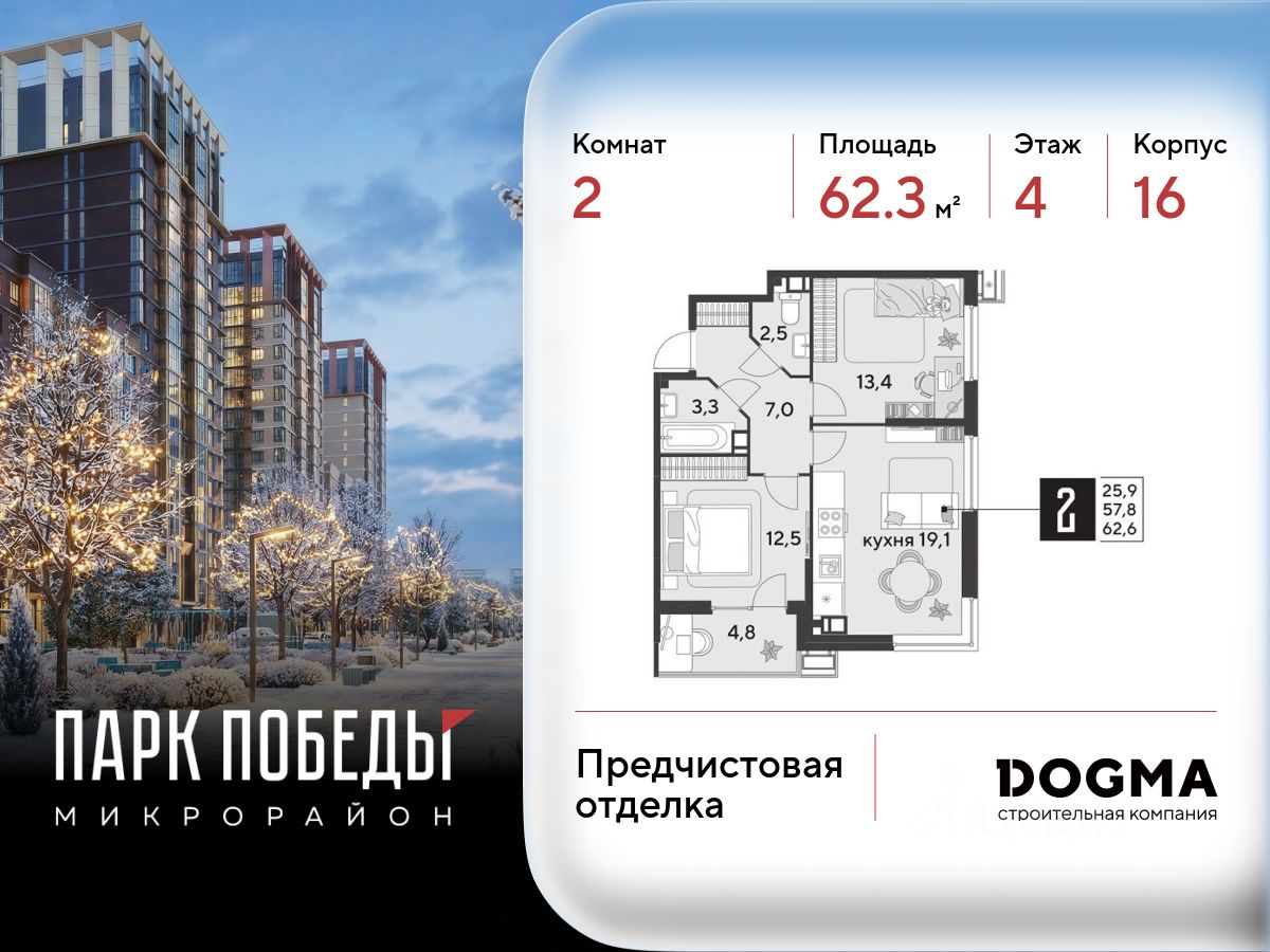 Срок сдачи: 1 кв. 2026, общей площадью 62.3 кв.м., на 4 этаже.