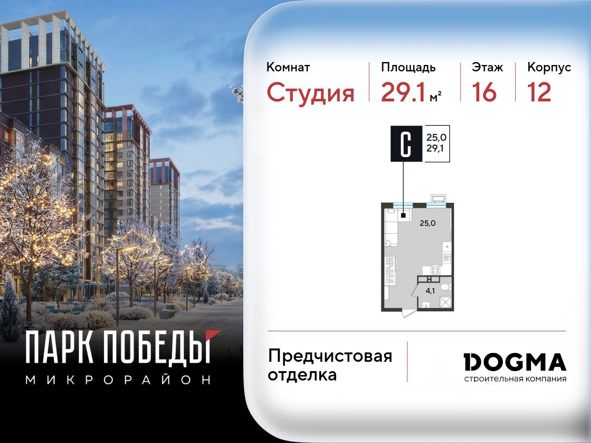 Срок сдачи: 2 кв. 2026, общей площадью 29.1 кв.м., на 16 этаже.
