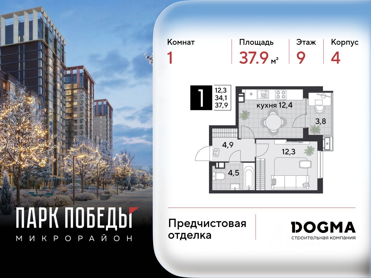 Срок сдачи: 2 кв. 2026, общей площадью 37.9 кв.м., на 9 этаже.