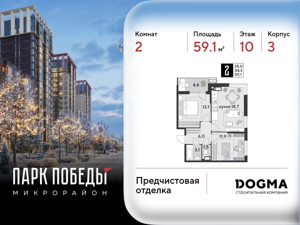 Срок сдачи: 2 кв. 2026, общей площадью 59.1 кв.м., на 10 этаже.