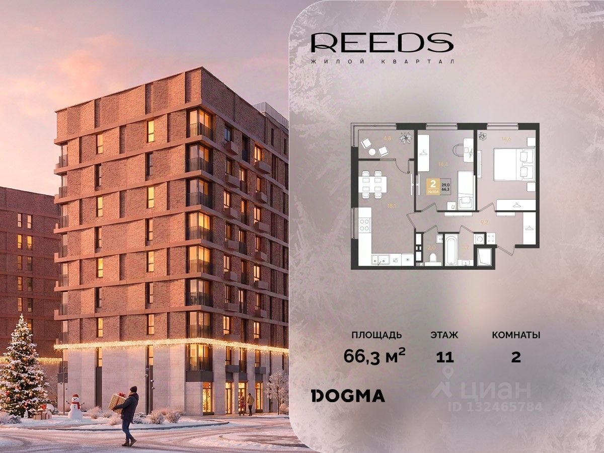 Срок сдачи: (4 кв. 2028, общей площадью 66.3 кв.м., на 11 этаже.)