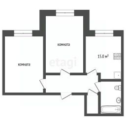 Общая площадь с лоджией - 52.45м2, жилая площадь- 26м2, кухня - 15м2, санузел совмещённый, комнаты изолированы, гардеробная.