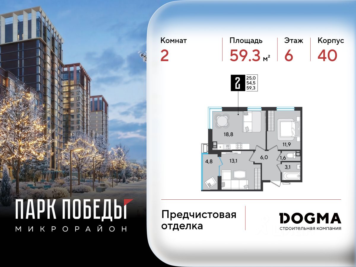 Срок сдачи: 2 кв. 2026, общей площадью 59.3 кв.м., на 6 этаже.