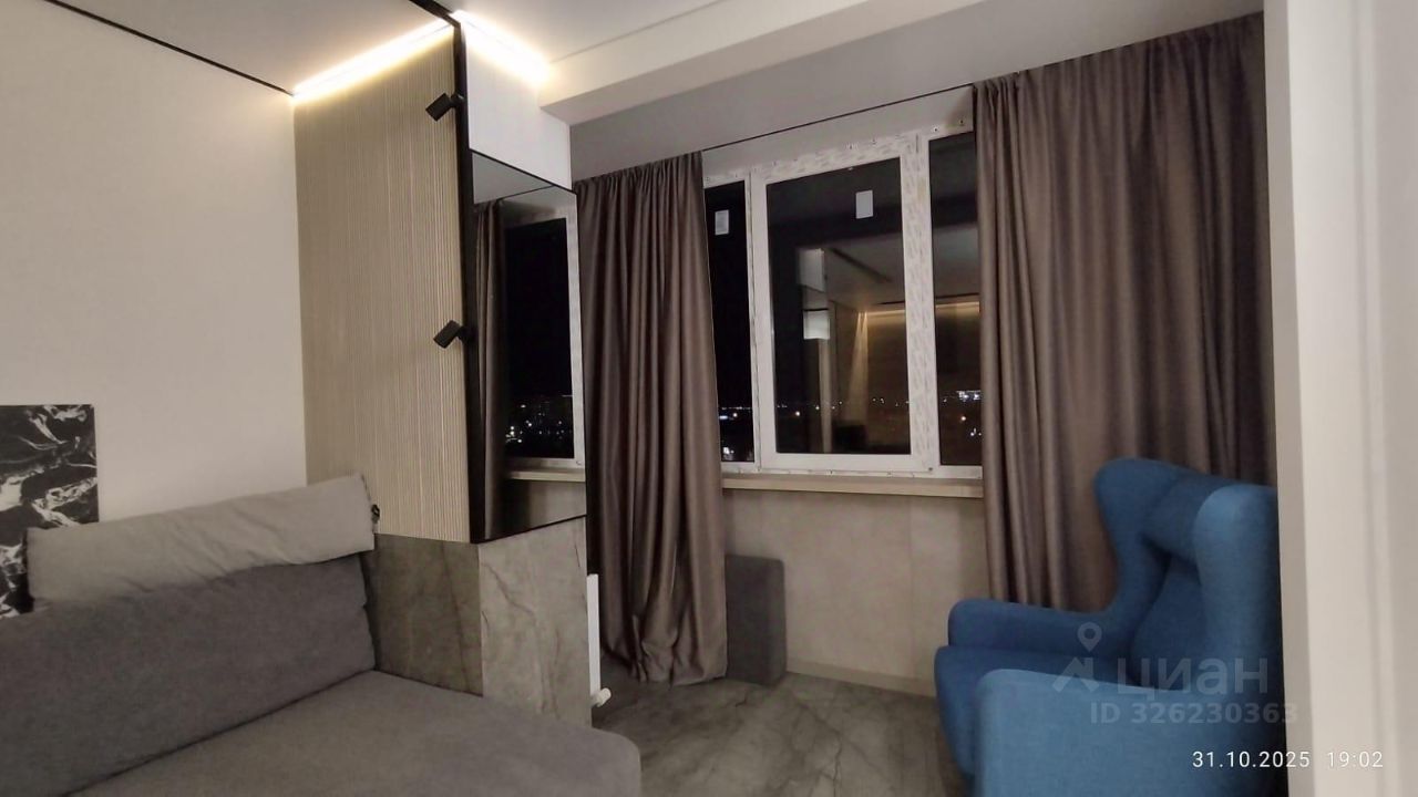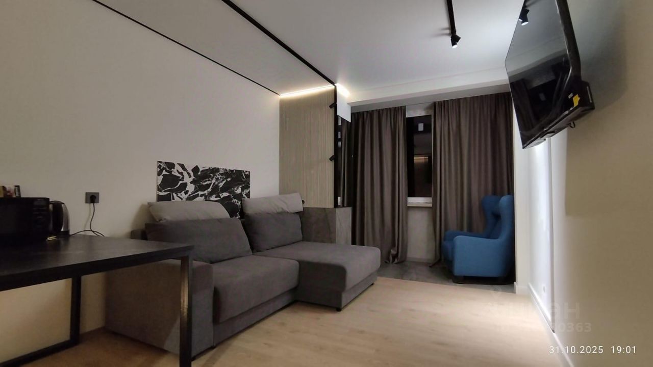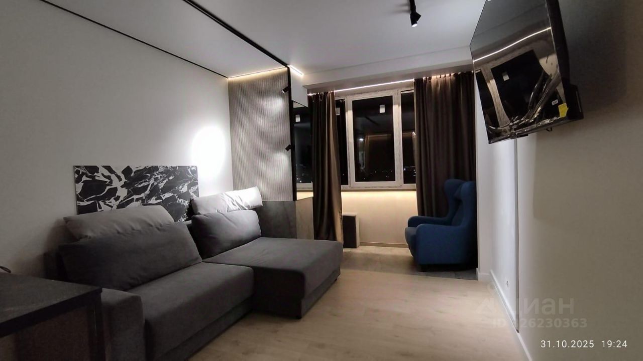 В квартире сделан качественный дизайнерский ремонт, использованы дорогие отделочные материалы, в том числе уникальные импортные облицовочные плиты. Зона лоджии удачно дополняет пространство комнаты, увеличивая жилую площадь, и имеет теплый пол. В стенах студии вмонтированы несколько больших зеркал, освещение в квартире выполнено с использование точечной и зонной подсветки. В ремонте санузла также использованы качественные материалы. В гостиной-кухне установлена сплит-система, мебель остается.