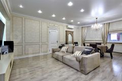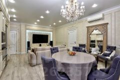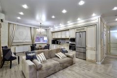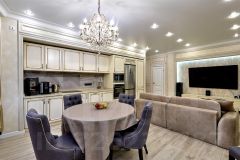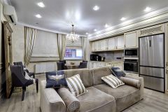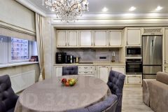 - Просторная кухня-гостиная (площадь около 30 кв.м), оснащенная встроенной техникой: духовым шкафом, микроволновкой и варочной поверхностью компании Electrolux, холодильником Haier и посудомоечной машиной Miele.