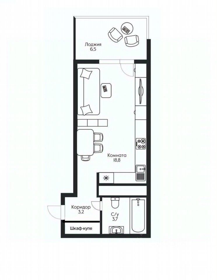 Простор и свет: Общая площадь 25,7 м² + утепленная лоджия 6,5 м².