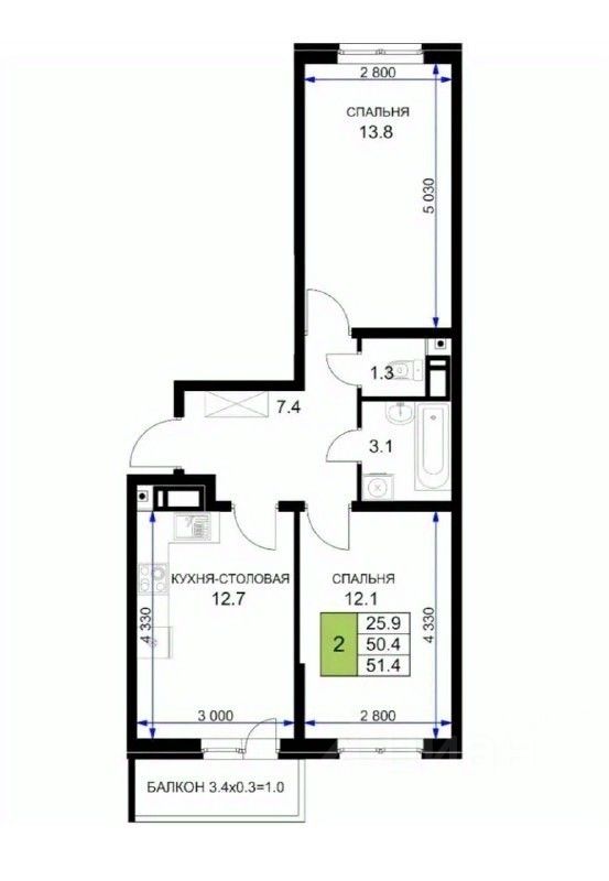 Площадь 53.8 кв.м: Просторная кухня-гостиная, две изолированные комнаты (возможна планировка "гостиная + спальня" или детская+кабинет).