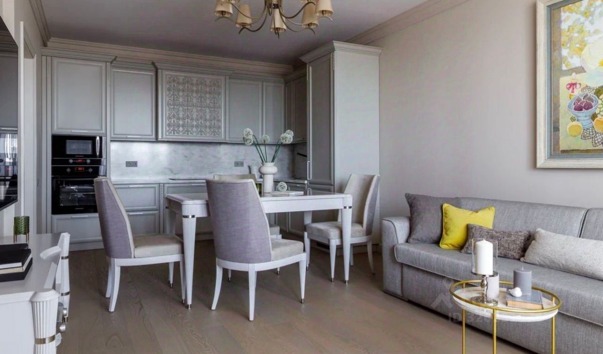 просторная кухня площадью 20 кв. м.; большая гостиная комната - 16 кв. м., вторая комната также имеет достаточно места для отдыха; Дорогие зарубежные материалы отделки, качественная дорогая мебель. личная парковка в подземном паркинге.