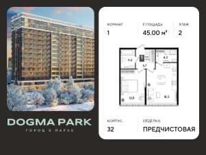В продаже 1-комнатная квартира от застройщика! Мкр. "DOGMA PARK" г. Краснодар, Литер 32 Срок сдачи: 3 кв. 2027, общей площадью 45 кв.м., на 2 этаже.