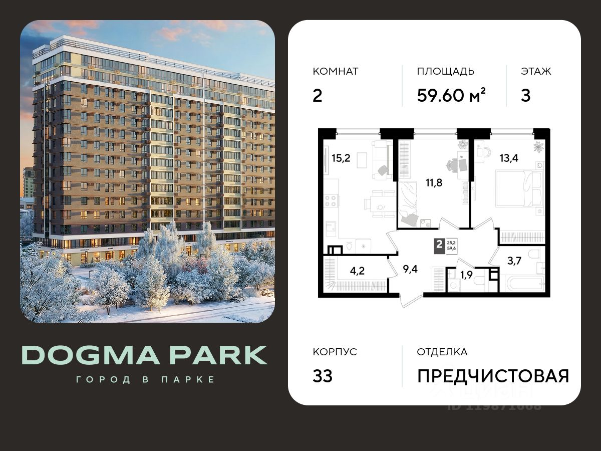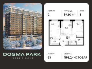 В продаже 2-комнатная квартира от застройщика! Мкр. "DOGMA PARK" г. Краснодар, Литер 33 Срок сдачи: 3 кв. 2027, общей площадью 59.6 кв.м., на 3 этаже.