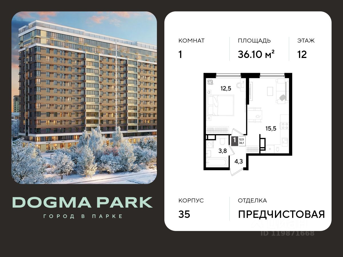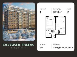 В продаже 1-комнатная квартира от застройщика! Мкр. "DOGMA PARK" г. Краснодар, Литер 35 Срок сдачи: 4 кв. 2027, общей площадью 36.1 кв.м., на 12 этаже.