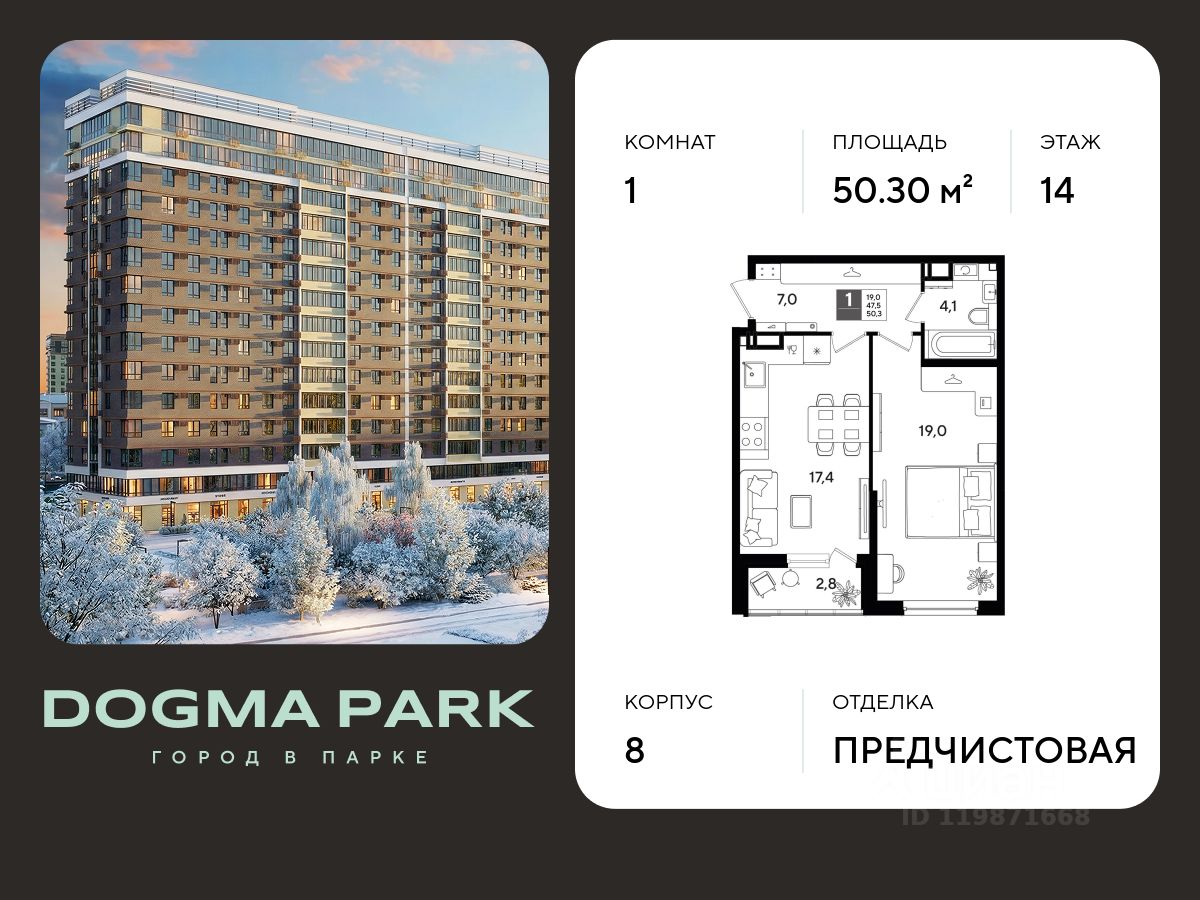 В продаже 1-комнатная квартира от застройщика! Мкр. "DOGMA PARK" г. Краснодар, Литер 8 Срок сдачи: 4 кв. 2026, общей площадью 50.3 кв.м., на 14 этаже.