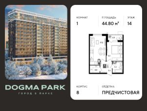 В продаже 1-комнатная квартира от застройщика! Мкр. "DOGMA PARK" г. Краснодар, Литер 8 Срок сдачи: 4 кв. 2026, общей площадью 44.8 кв.м., на 14 этаже.