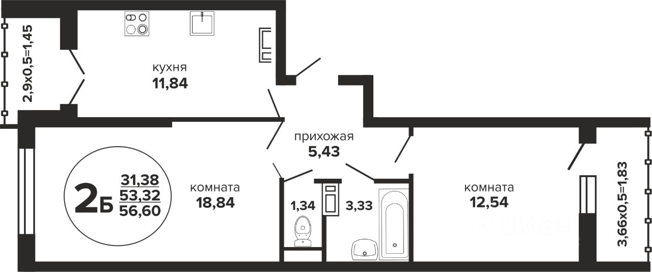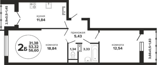 Общая площадь56,6 м²