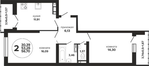Общая площадь57,3 м²