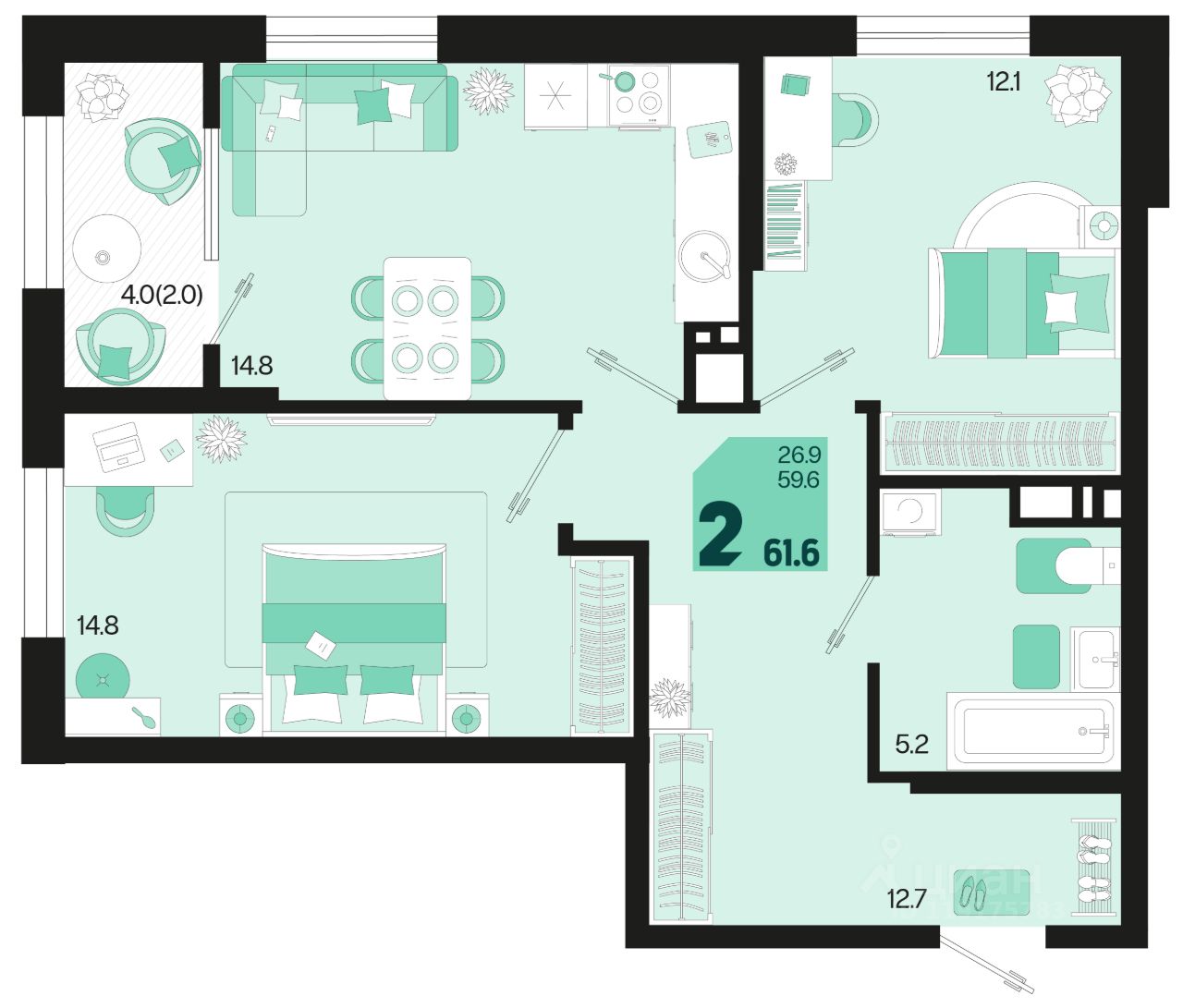 Продаётся 2-комнатная квартира в строящемся доме (Квартал 1.1 - Литер 1), срок сдачи: II-кв. 2026, общей площадью 61.6 кв.м., на 14 этаже. Жилой район "Первое