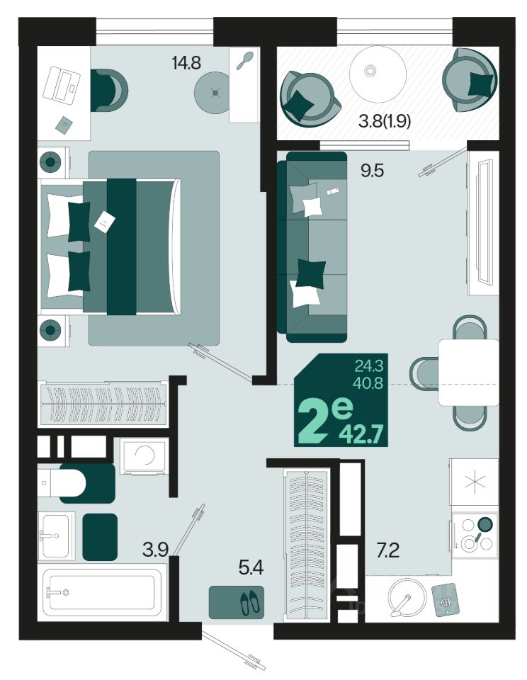 Продаётся 2-комнатная квартира в строящемся доме (Квартал 1.10 - Литер 2), срок сдачи: III-кв. 2026, общей площадью 42.7 кв.м., на 13 этаже. Жилой район "Первое
