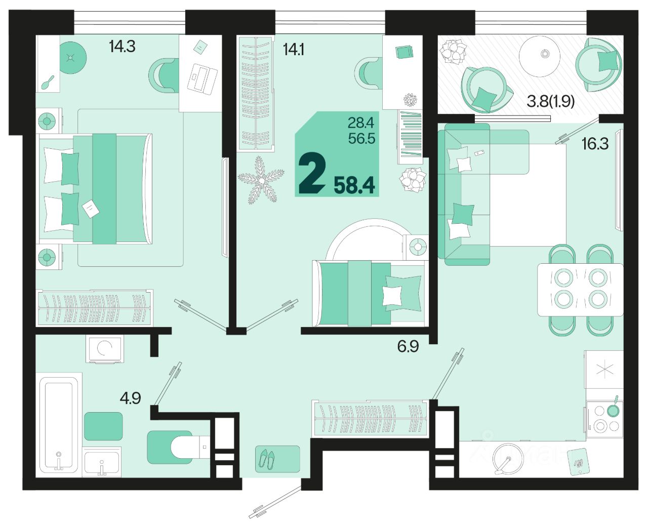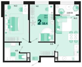 Продаётся 2-комнатная квартира в строящемся доме (Квартал 1.10 - Литер 1), срок сдачи: III-кв. 2026, общей площадью 58.4 кв.м., на 7 этаже. Жилой район "Первое