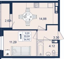 1 комнатная квартира с ремонтом 34.9 м², на 6 этаже в жилом комплексе "Дом 101".