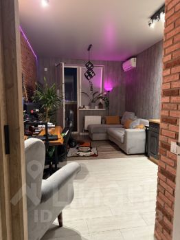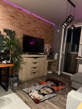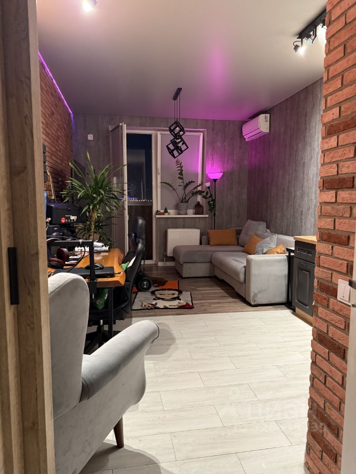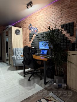 В комнате сделаны теневые потолки с цветным освещением над декоративными кирпичом.