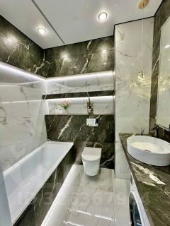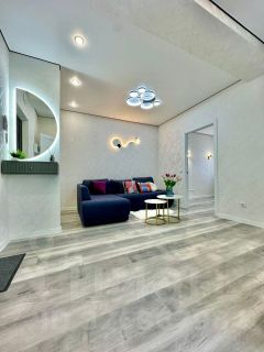 Дизайнерский ремонт премиум-уровня: Капитальный ремонт выполнен по индивидуальному проекту. Использованы дорогие материалы: керамогранит, дизайнерские обои, качественный ламинат, натяжные потолки со светодиодной подсветкой. Состояние — идеальное.