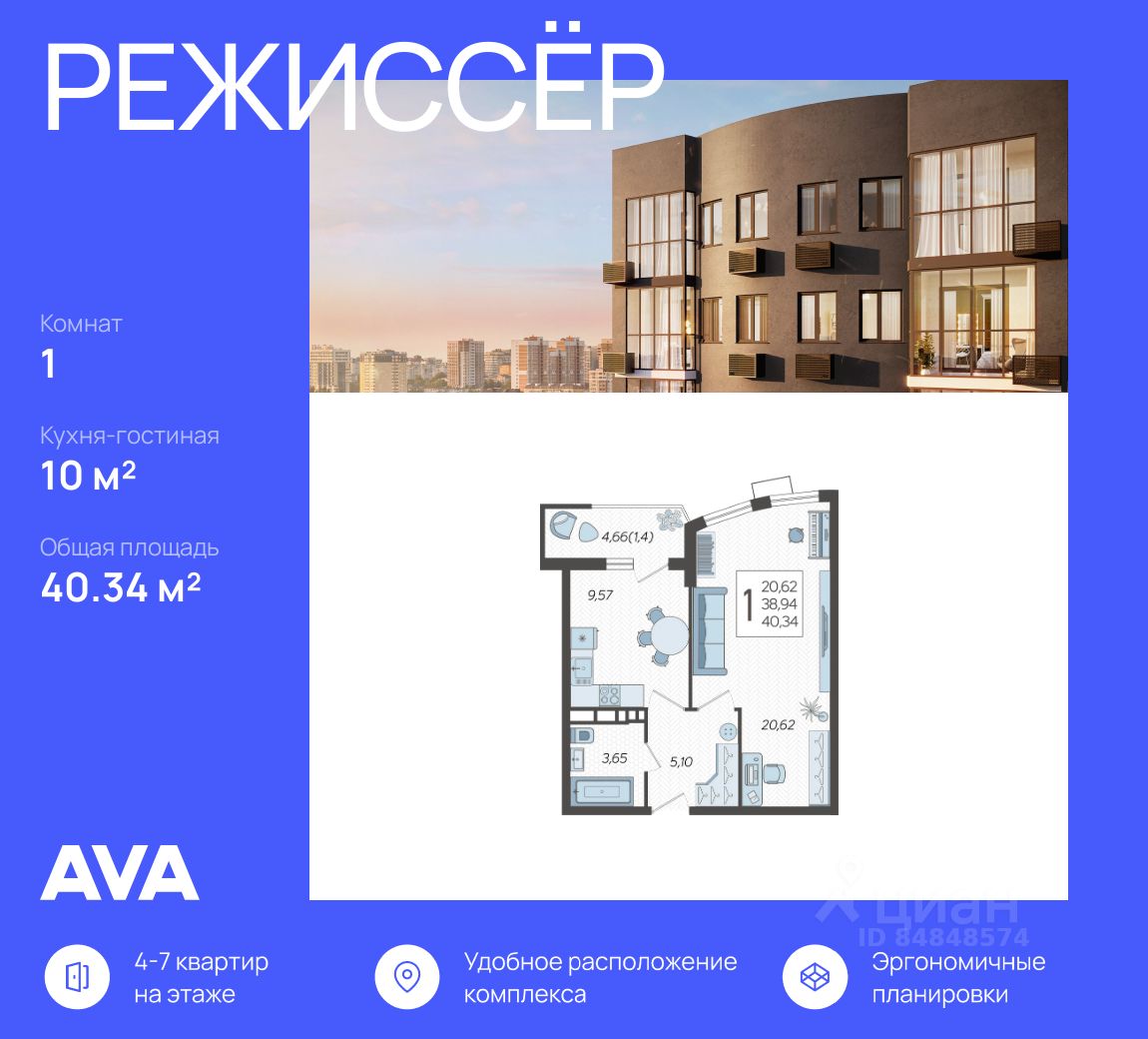 В продаже 1-комнатная квартира 40.34 кв. м, расположенная в 4 корпусе жилого комплекса комфорт-класса "Режиссёр". Комплекс от девелопера AVA находится в развитом районе Краснодара, в 5 минутах пешком от крупного ТРЦ.