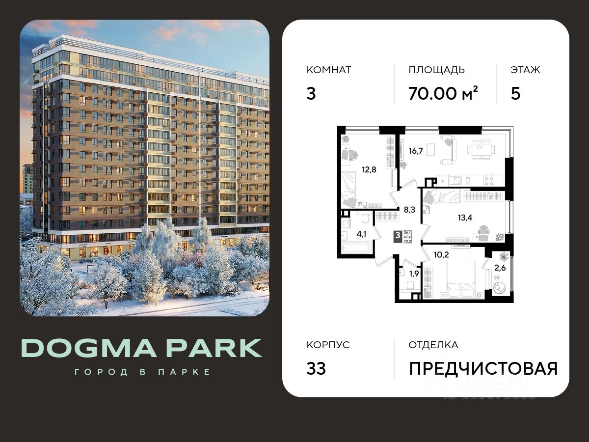 В продаже 3-комнатная квартира от застройщика! Мкр. "DOGMA PARK" г. Краснодар, Литер 33 Срок сдачи: 3 кв. 2027, общей площадью 70 кв.м., на 5 этаже.