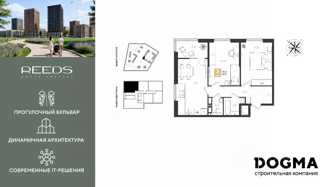 Срок сдачи: 4 кв. 2028, общей площадью 66.3 кв.м., на 18 этаже.