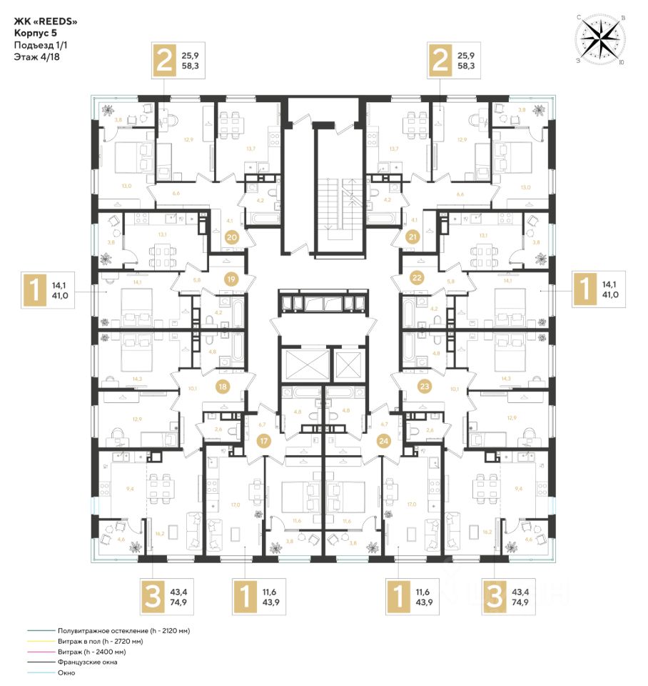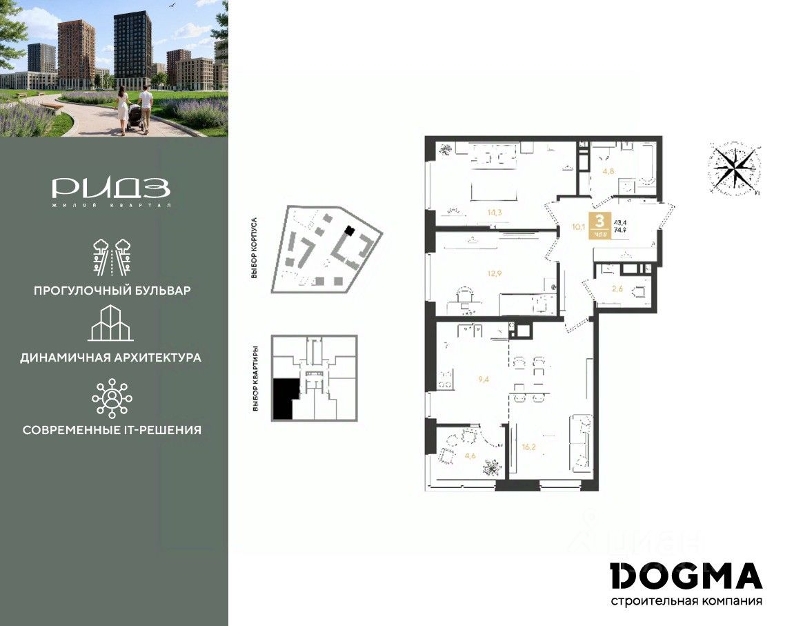 Срок сдачи: 3 кв. 2028, общей площадью 74.9 кв.м., на 4 этаже.