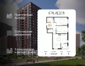 Срок сдачи: 3 кв. 2028, общей площадью 74.9 кв.м., на 5 этаже.