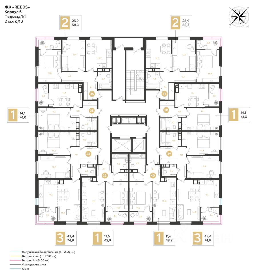 Срок сдачи: 4 кв. 2028, общей площадью 43.9 кв.м., на 6 этаже.