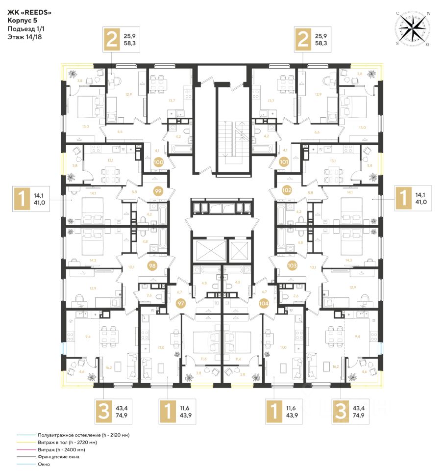 Срок сдачи: 4 кв. 2028, общей площадью 74.9 кв.м., на 14 этаже.