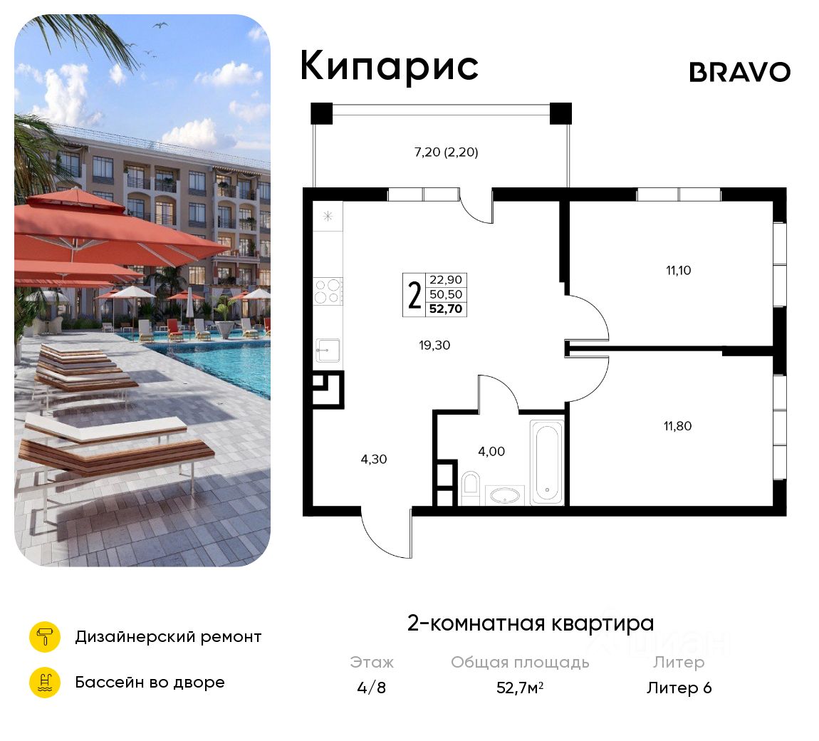 Продаётся 2-комн. квартира от застройщика c отделкой в ЖК "Кипарис" на 4 этаже. Общая площадь:52.7 кв.м., площадь просторной кухни-столовой:19.3. B квартире один балкон. Высота потолков 2.81 м.