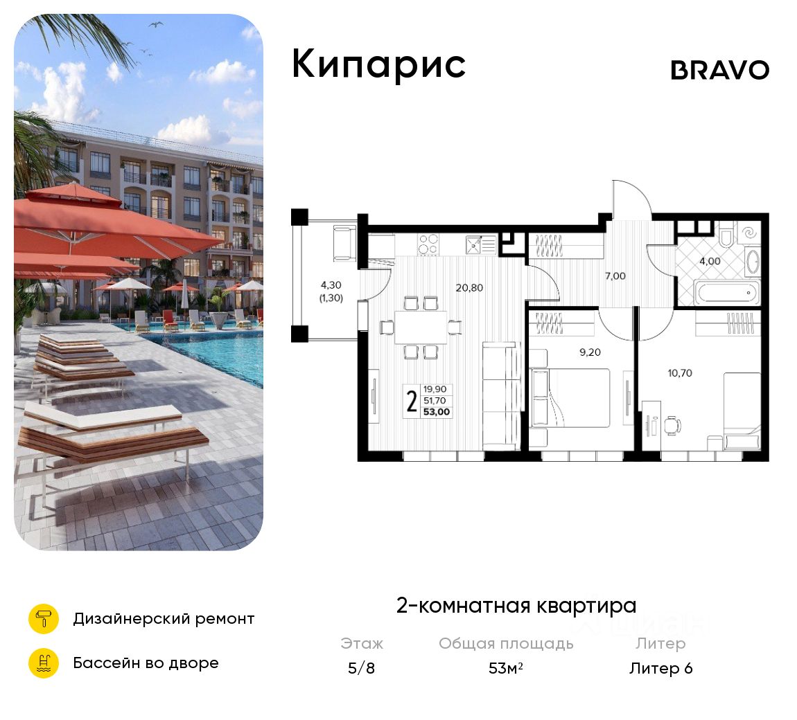 Продаётся 2-комн. квартира от застройщика c отделкой в ЖК "Кипарис" на 5 этаже. Общая площадь:53 кв.м., площадь просторной кухни-столовой:20.8. B квартире один балкон. Высота потолков 2.81 м.