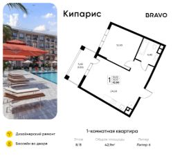 Продаётся 1-комн. квартира от застройщика c отделкой в ЖК "Кипарис" на 8 этаже. Общая площадь:42.9 кв.м., площадь просторной кухни-столовой:24.6. B квартире один балкон. Высота потолков 2.81 м.
