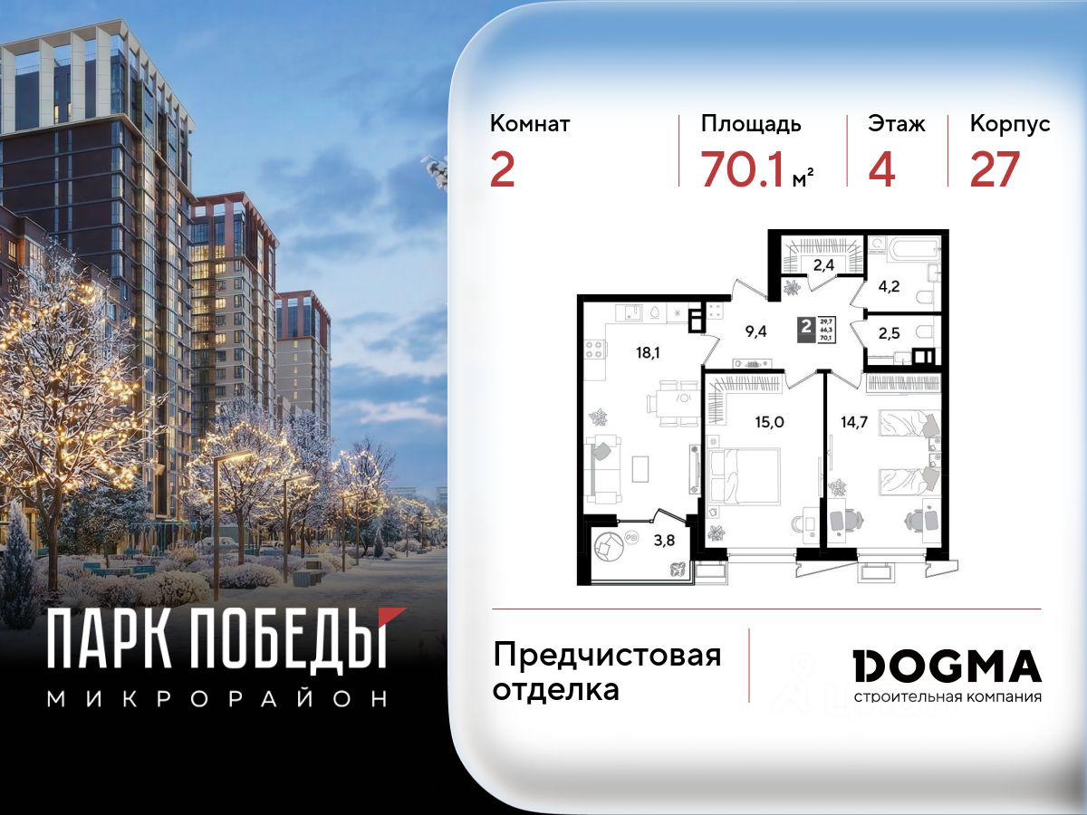 Срок сдачи: 4 кв. 2025, общей площадью 70.1 кв.м., на 4 этаже.