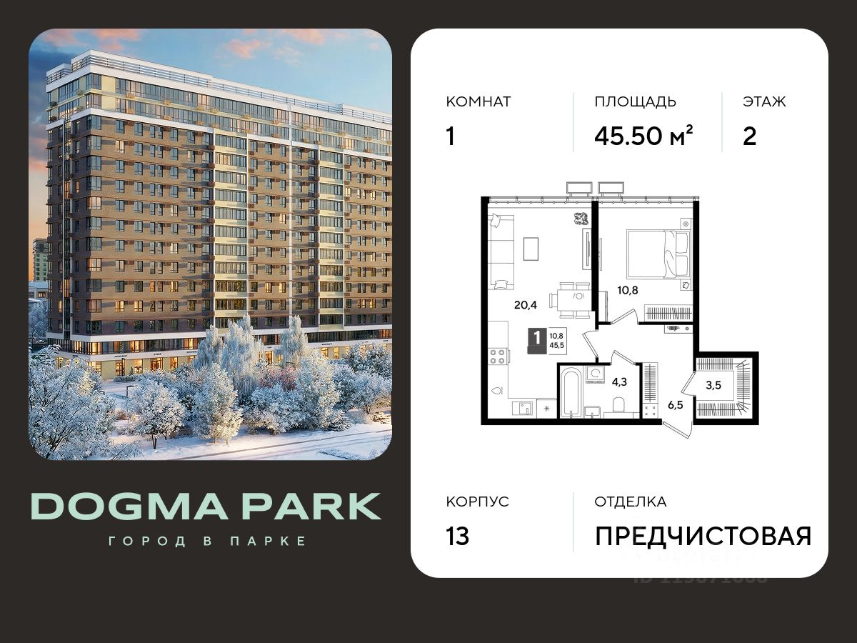 В продаже 1-комнатная квартира от застройщика! Мкр. "DOGMA PARK" г. Краснодар, Литер 14 Срок сдачи: 4 кв. 2027, общей площадью 45.5 кв.м., на 2 этаже.
