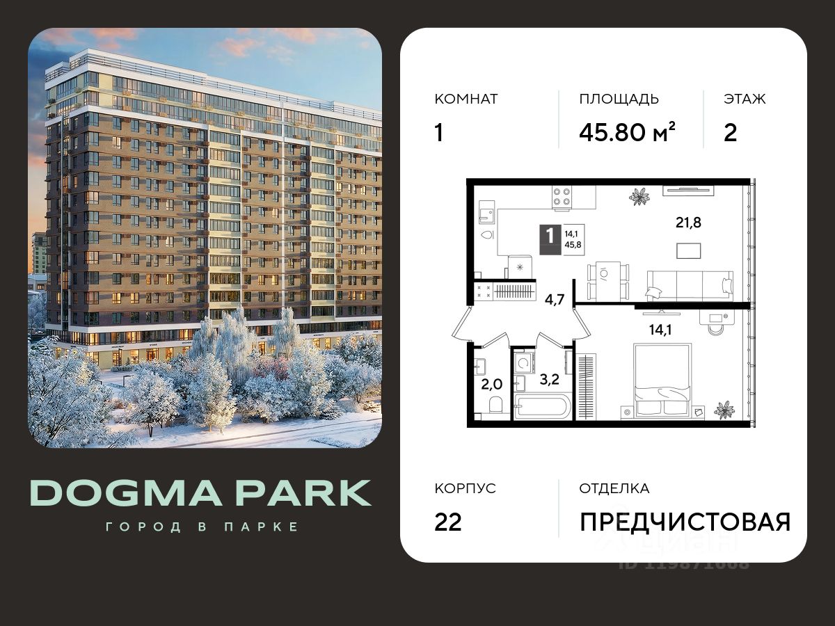 В продаже 1-комнатная квартира от застройщика! Мкр. "DOGMA PARK" г. Краснодар, Литер 22 Срок сдачи: 4 кв. 2027, общей площадью 45.8 кв.м., на 2 этаже.