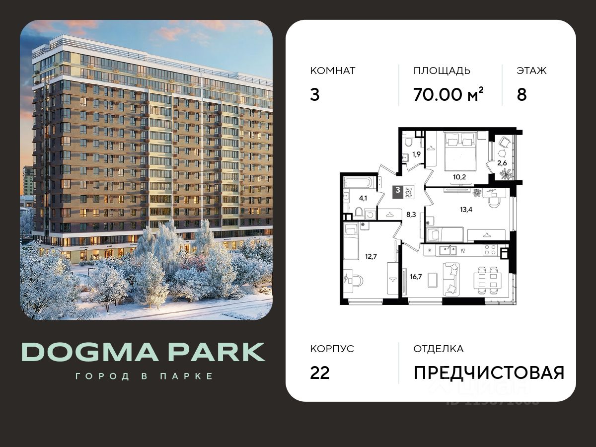 В продаже 3-комнатная квартира от застройщика! Мкр. "DOGMA PARK" г. Краснодар, Литер 22 Срок сдачи: 4 кв. 2027, общей площадью 70 кв.м., на 8 этаже.