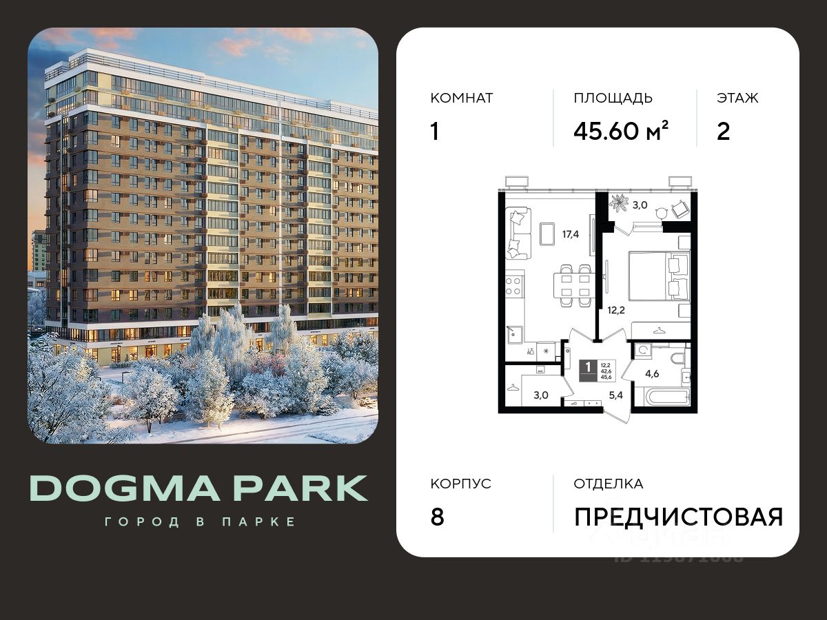 В продаже 1-комнатная квартира от застройщика! Мкр. "DOGMA PARK" г. Краснодар, Литер 8 Срок сдачи: 4 кв. 2026, общей площадью 45.6 кв.м., на 2 этаже.