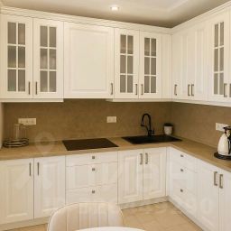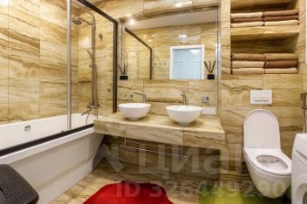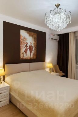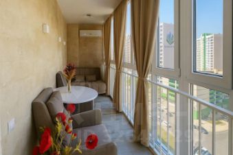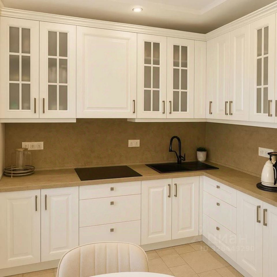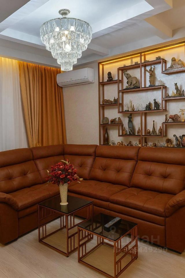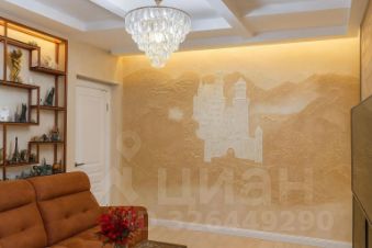 **Особенности квартиры:**- Кухня-гостиная в стиле неоклассики: белый фасад с фрезеровкой, индукционная плита, встроенные шкафы-пеналы, чёрная мойка.- Ванная комната с керамогранитом "под мрамор", стеклянный экран, две раковины.- Гостиная с коричневым велюровым диваном, авторским стеллажом с подсветкой, хрустальной люстрой и фреской "Замок в горах".- Спальня с кроватью с мягким изголовьем и барельефным панно "Леди".- Лоджия 14 м² с керамогранитом, витражным остеклением, зоной отдыха и видом на город.- В каждой комнате сплит-системы, в прихожей шкаф-купе, мягкая скамья и зеркало.