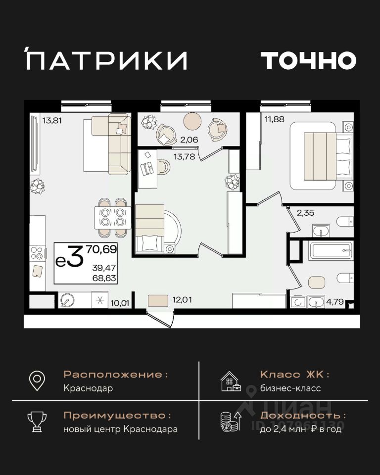 Флагманский проект группы компаний Точно - жилой комплекс бизнес-класса Патрики, это 10 домов разной этажности расположившихся на 28,5 гектарах. Жилой комплекс с концепцией город в город - прогулочные аллеи, парковая территория, 3 детских сада, 2 школы - одна из которых частная, Гранд аллея с ресторанами, фонтанами и модными бутиками, уникальные мафы и ландшафтный дизайн, создают особую атмосферу - место в котором хочется находиться. В Патриках предусмотрен и креативный кластер Цех, который включает в себя пространство для коворкинга, фудкорт, бутики, детский комплекс, лектории, фитнес-клуб Баланс с волной для сёрфа. Но и это еще не все ГК Точно уважает историю, поэтому мы сохранили 2 башни - наследство от завода "Сельмаш" исторический арт-объект назвали Мастер и Маргарита.