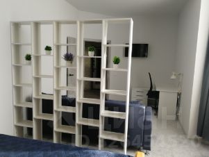 В зале: выполнено зонирование полочной системой, раскладной диван, письменный стол с откатным креслом, смарт тв, детская кроватка с матрасом из кокосового волокна, 2-х местная кровать из массива сосны с матрасом аскона, кондиционер, особый уют придает ковролин,