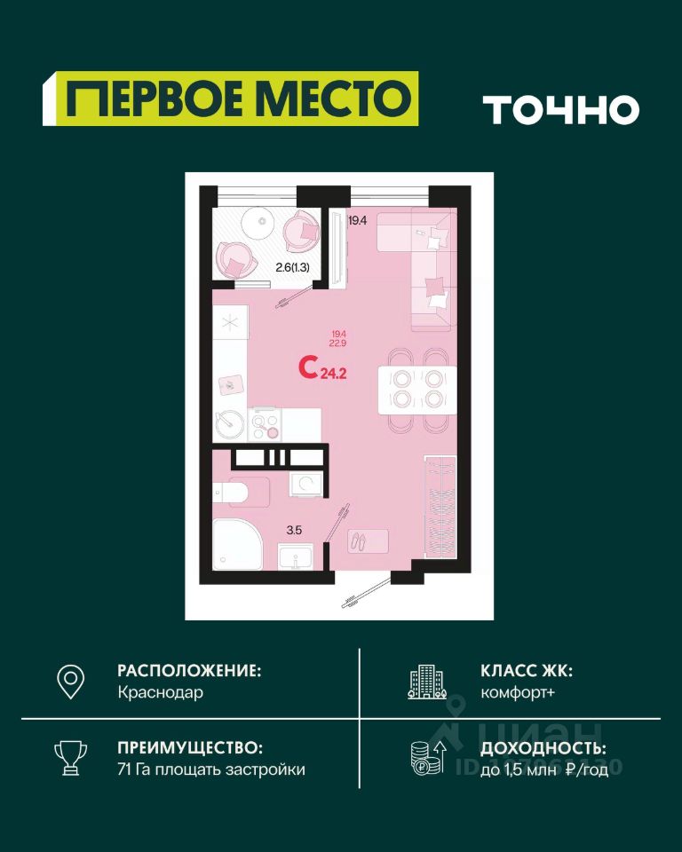 Жилой район "Первое место"- один из самых масштабных проектов в России. На территории 71 га 18 кварталов, 31 дом переменной этажности от 8 до 18 этажей, собственный парк 9 га, храмовый комплекс, пешеходный бульвар "Круг семьи", детские и спортивные площадки, мангальные зоны и различные локации для отдыха. В шаговой доступности действующие муниципальные образовательные учреждения: школа на 1 100 мест и детский сад на 250 мест. Помимо этого, в жилом районе "Первое место" построятся школа на 1700 мест с крытым 25-метровым бассейном и 5 детских садов на 1 490 мест. На первых этажах многоуровневых парковок "паркхабов" разместится более 61 тыс м2 коммерческих помещений. Жителям будут доступны собственный фитнес-центр, кафе, рестораны и магазины. В каждом подъезде предусмотрены дизайнерские холлы в стиле лобби отелей, консьерж-сервис, лапомойки, отдельные колясочные и велосипедные. Также в домах будут просторные кладовые помещения и комнаты для хранения почты с почтоматами для получения посылок из маркетплейсов.