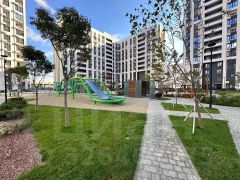 Красивый внутренний двор с зелеными насаждениями и детскими площадками.