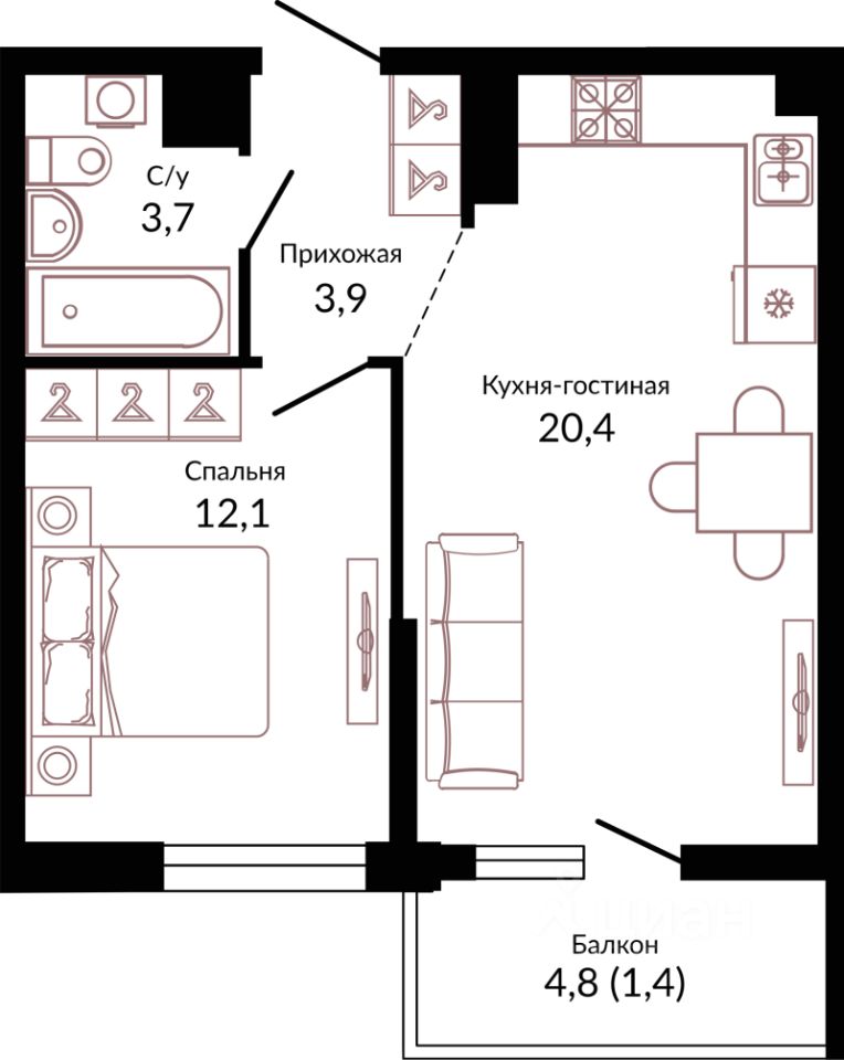 Продаётся 1-комнатная квартира в сданном доме (Литер 1.2), срок сдачи: IV-кв. 2024, общей площадью 42.8 кв.м., на 11 этаже. Жилой комплекс по адресу: г. Краснодар, Прикубанский внутригородской округ, отделение почтовой связи Калинино.